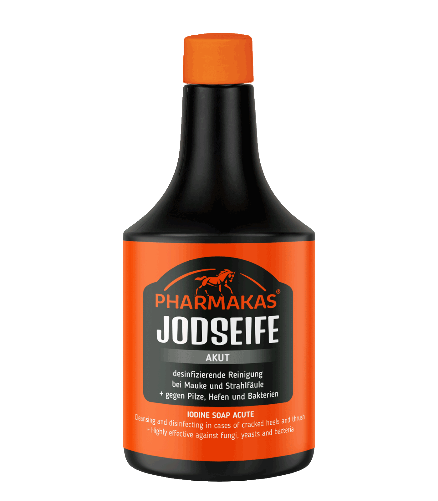Pharmakas® Jodseife Akut ist speziell geeignet für eine desinfizierende Reinigung am Pferd. Sie ist hochwirksam gegen Pilze, Hefen und Bakterien und besonders effektiv bei Mauke und Strahlfäule. Gerade in der nassen Jahreszeit hilft die reinigende und desinfizierende Pharmakas® Jodseife Akut bei Mauke. Dabei ist die speziell abgestimmte PVP-Jod Formulierung sehr gut haut- und fellverträglich. Zudem spendet sie Feuchtigkeit und pflegt mit Glycerin die Haut, sodass Pharmakas® Jodseife Akut bedenkenlos mehrfach angewandt werden kann.