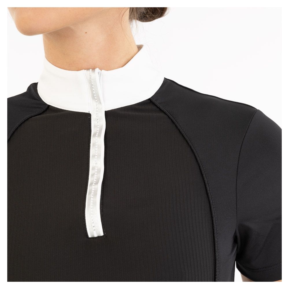 Das BR Turnierhemd Isabel vereint elegantes Design mit höchstem Komfort. Durch die taillierte, geformte Passform und das hochwertige Funktionsmaterial bleiben Sie selbst an heißen Turniertagen kühl und bequem. Die Glitzerlinien auf der Vorderseite sowie der verdeckte Frontreißverschluss mit Glitzer-Detail am Kragen verleihen diesem Hemd eine besonders edle Note.