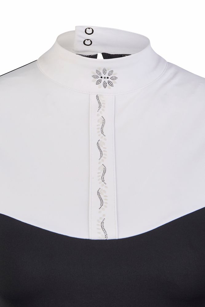 Besonders stilvoll: Hochwertige Flock-Strassstein-Applikationen auf der Knopfblende, am Kragen & den Ärmelmanschetten sowie ein dezentes Tropfen-Cutout am Rücken.