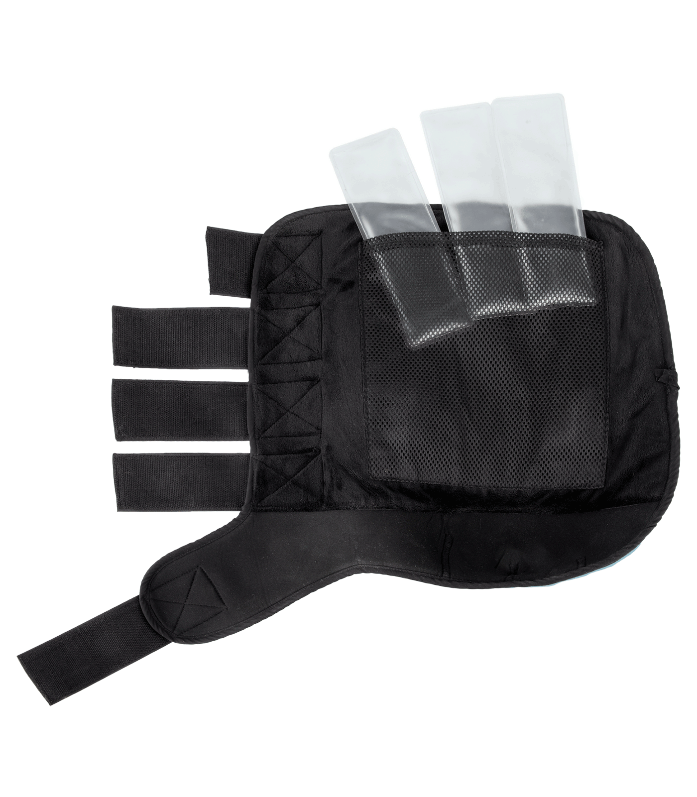 Die Gamasche hilft bei Sehnenschäden, indem sie die Neuausrichtung der Sehnenfasern unterstützt. Die Kühlfunktion wirkt entzündungshemmend, während die Vibrationsfunktion die Blutzirkulation anregt und Schwellungen reduziert. Zusätzlich kann die Wärmefunktion bei längeren Ruhephasen im Winter das Aufwärmen und die Förderung der Durchblutung im Pferdebein unterstützen, was das Verletzungsrisiko verringern kann.