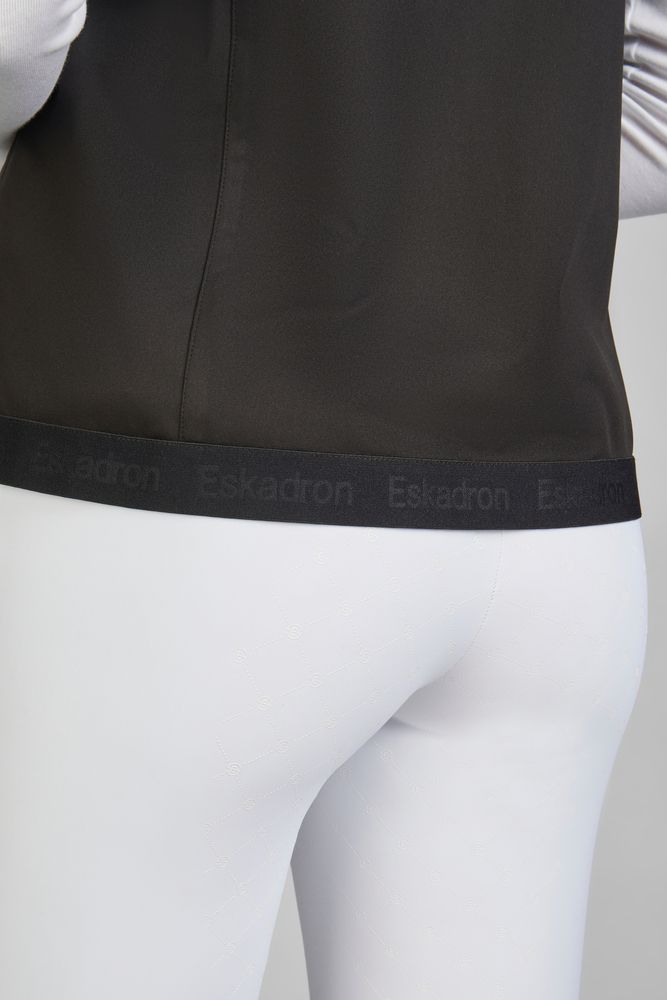 Die taillierte Passform sorgt für eine feminine Silhouette, während der wasserdichte 2-Wege-Front-Reißverschluss mit Kinnschutz zusätzlichen Schutz und Flexibilität bietet. Die elastischen Einfassungen an den Ärmelausschnitten mit Eskadron-Print sowie der elastische Saumabschluss mit Eskadron-Prägung garantieren eine perfekte Passform und einen sportlichen Look.